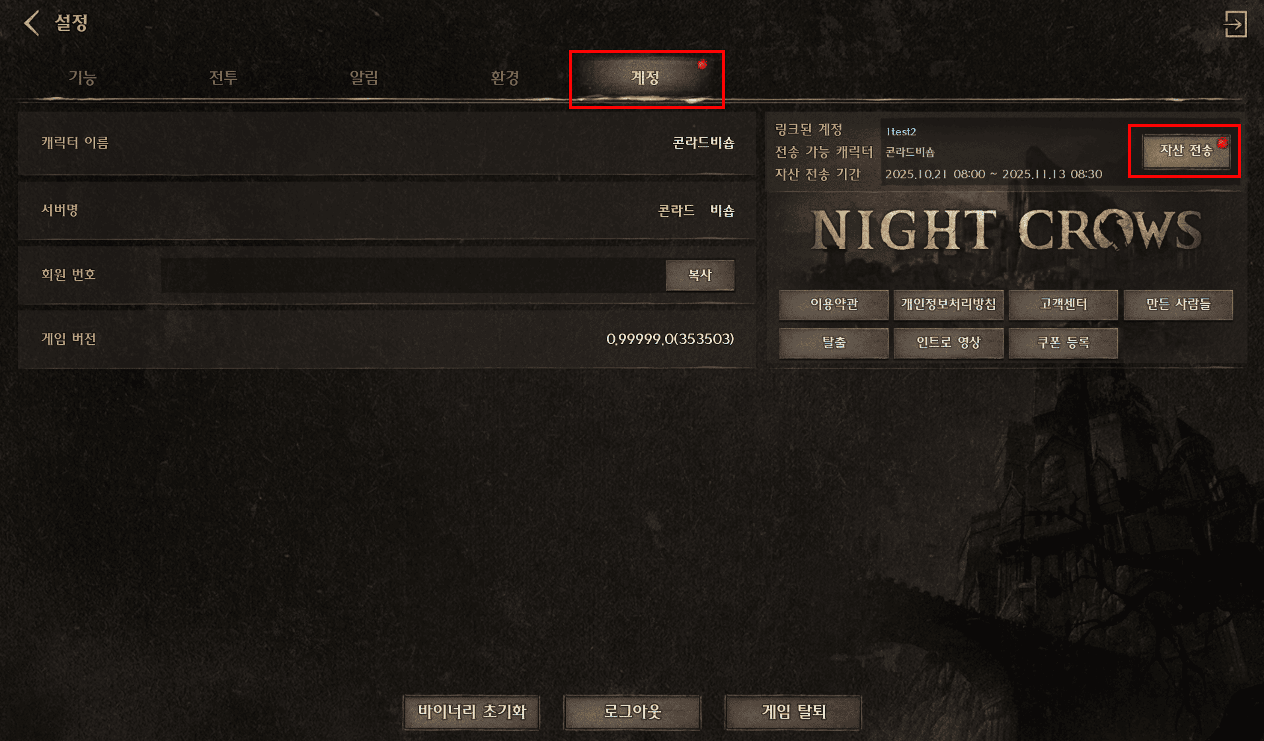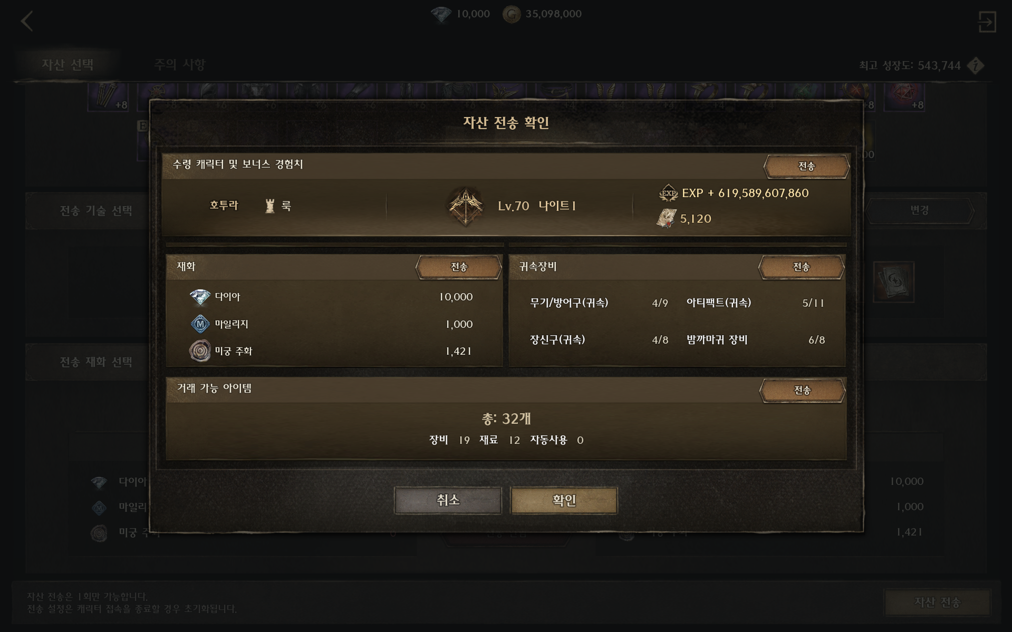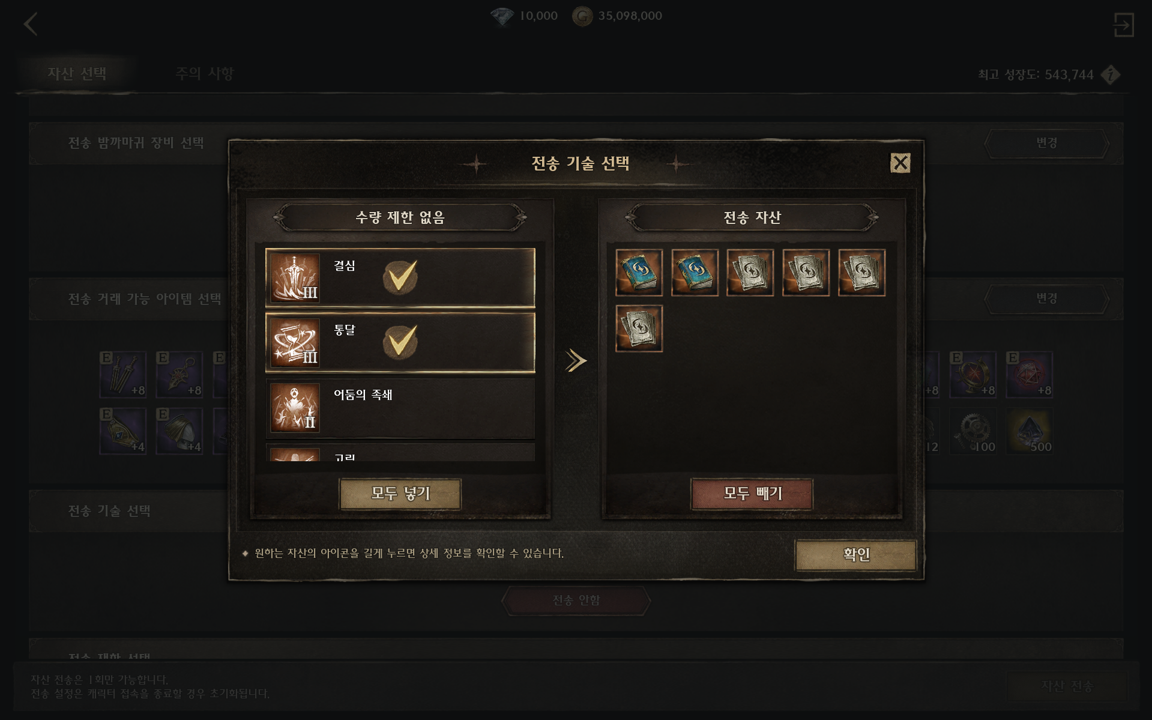 • 자산 전송은 60 레벨 이상인 캐릭터만 가능합니다.