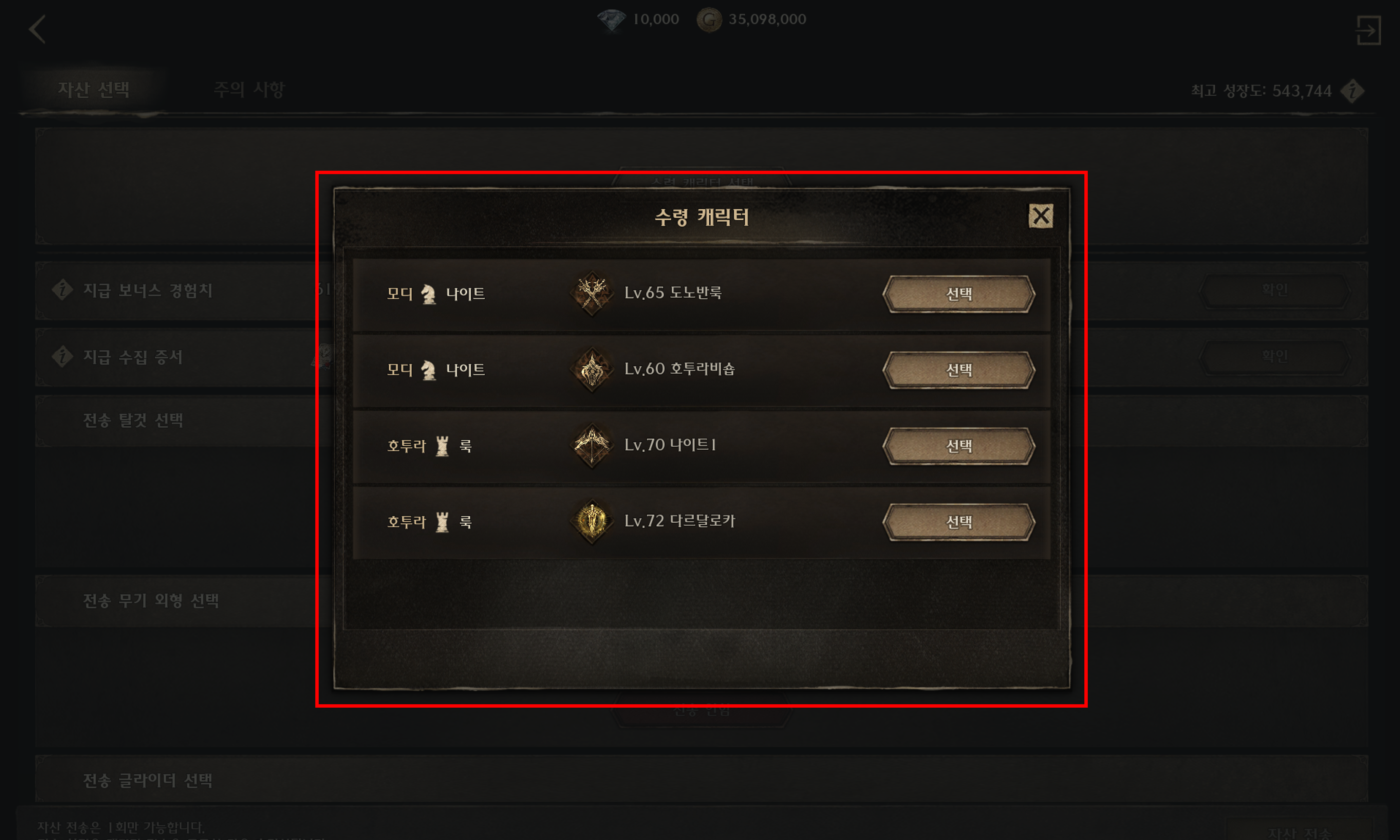 • 자산 전송 선택 품목을 제외한 캐릭터는 삭제되지 않고 유지됩니다.