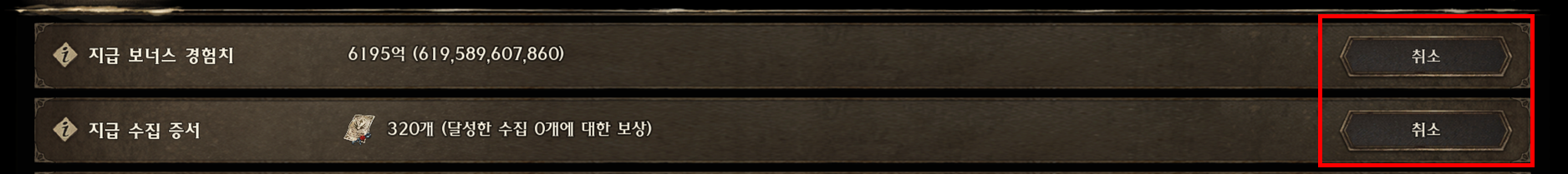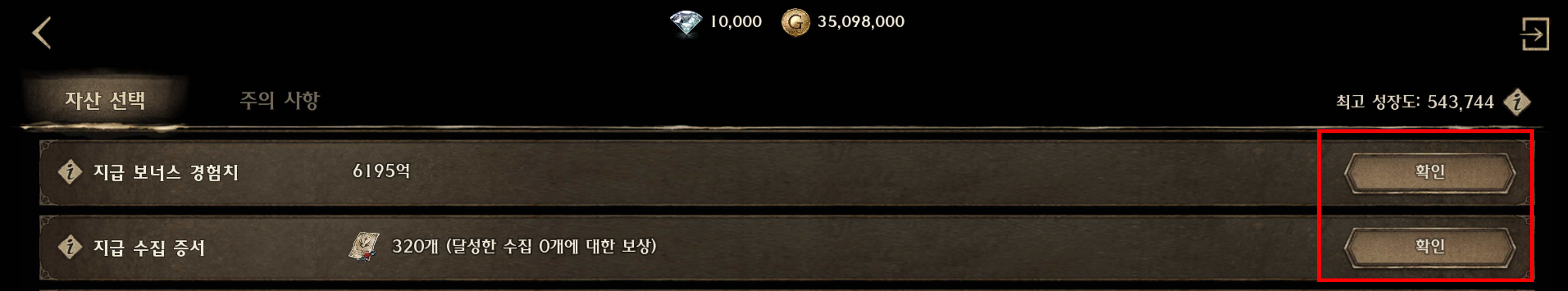 • 전송될 보너스 경험치와 수집 증서 항목에서 확인 버튼을 눌러 확정할 수 있습니다.
