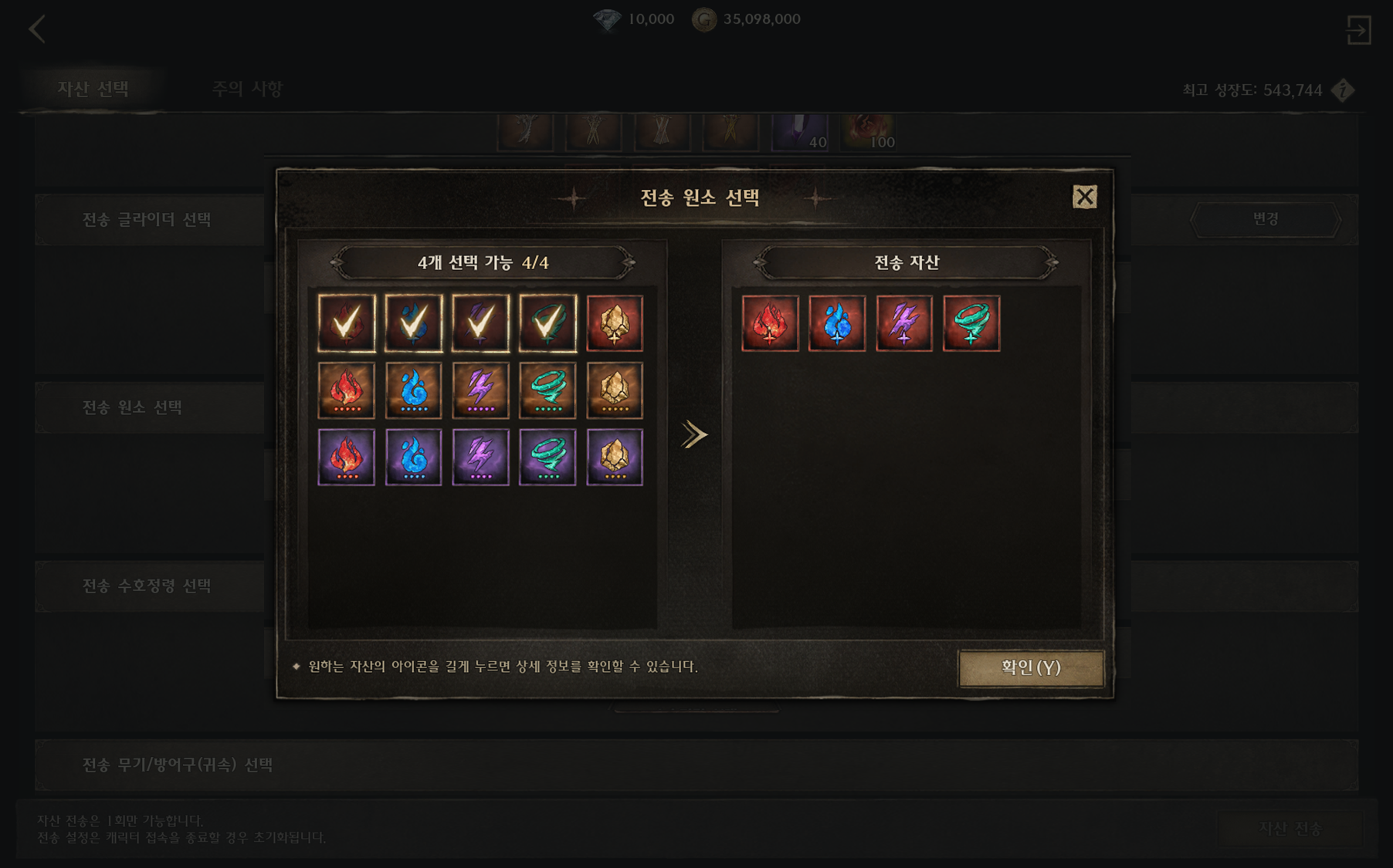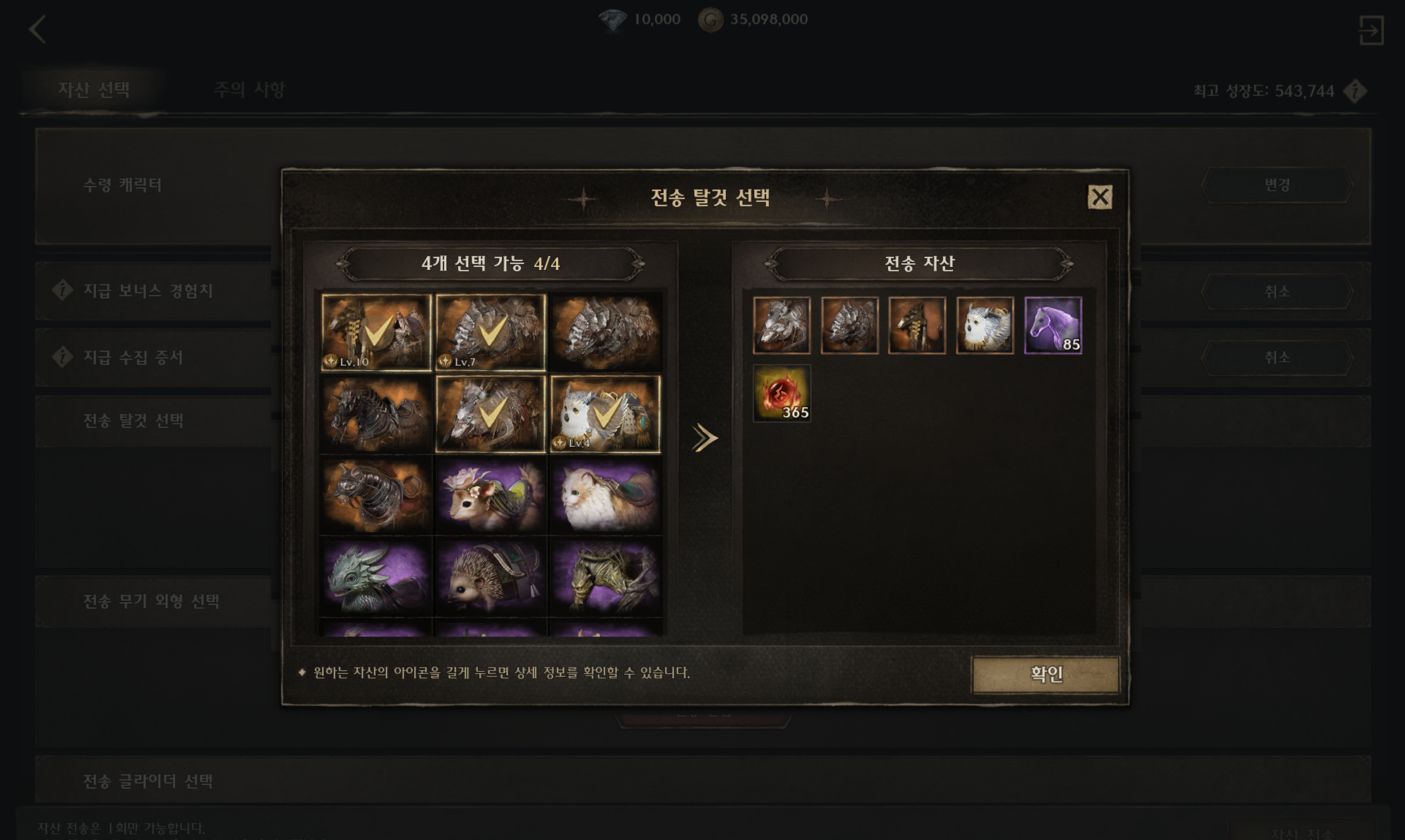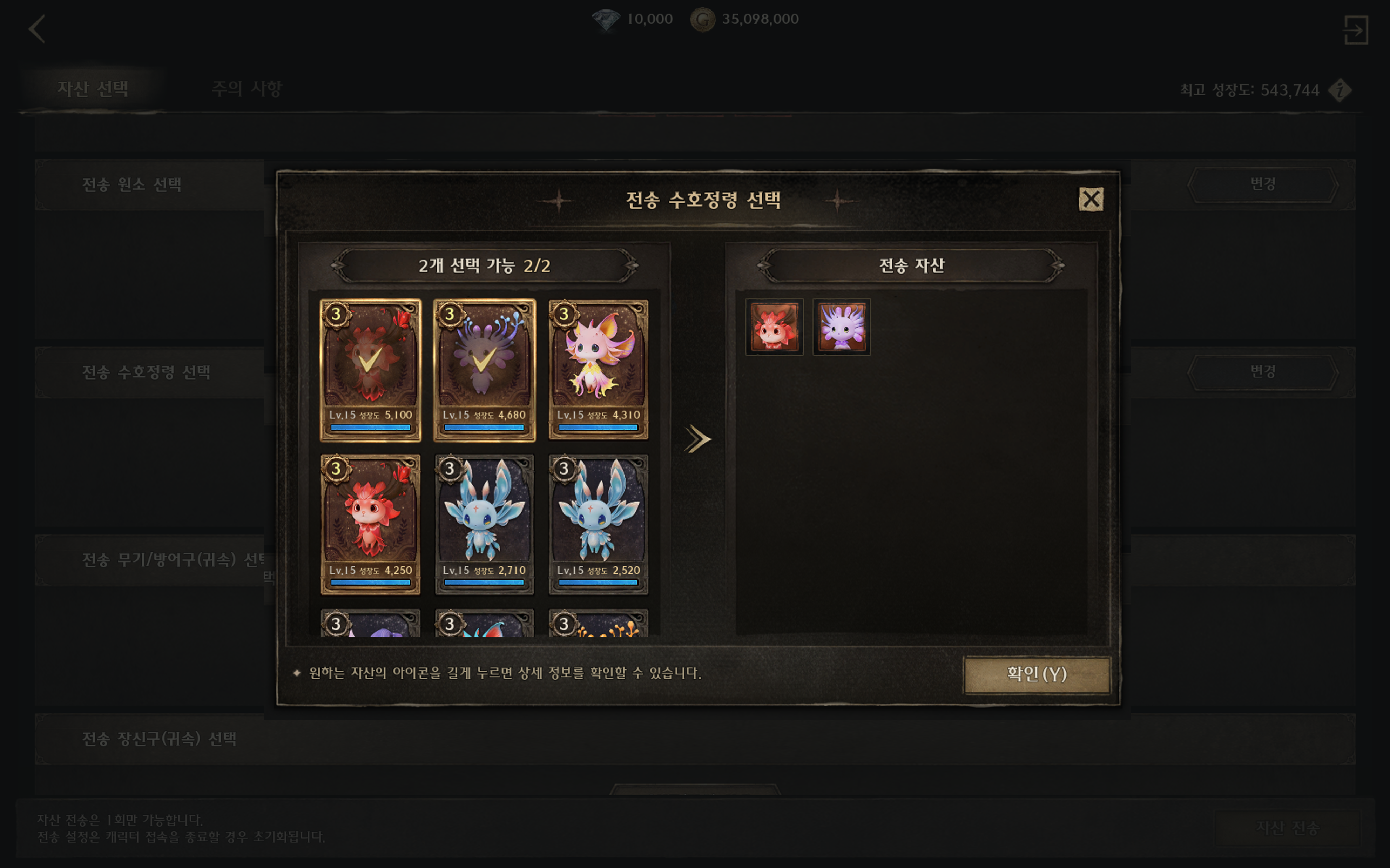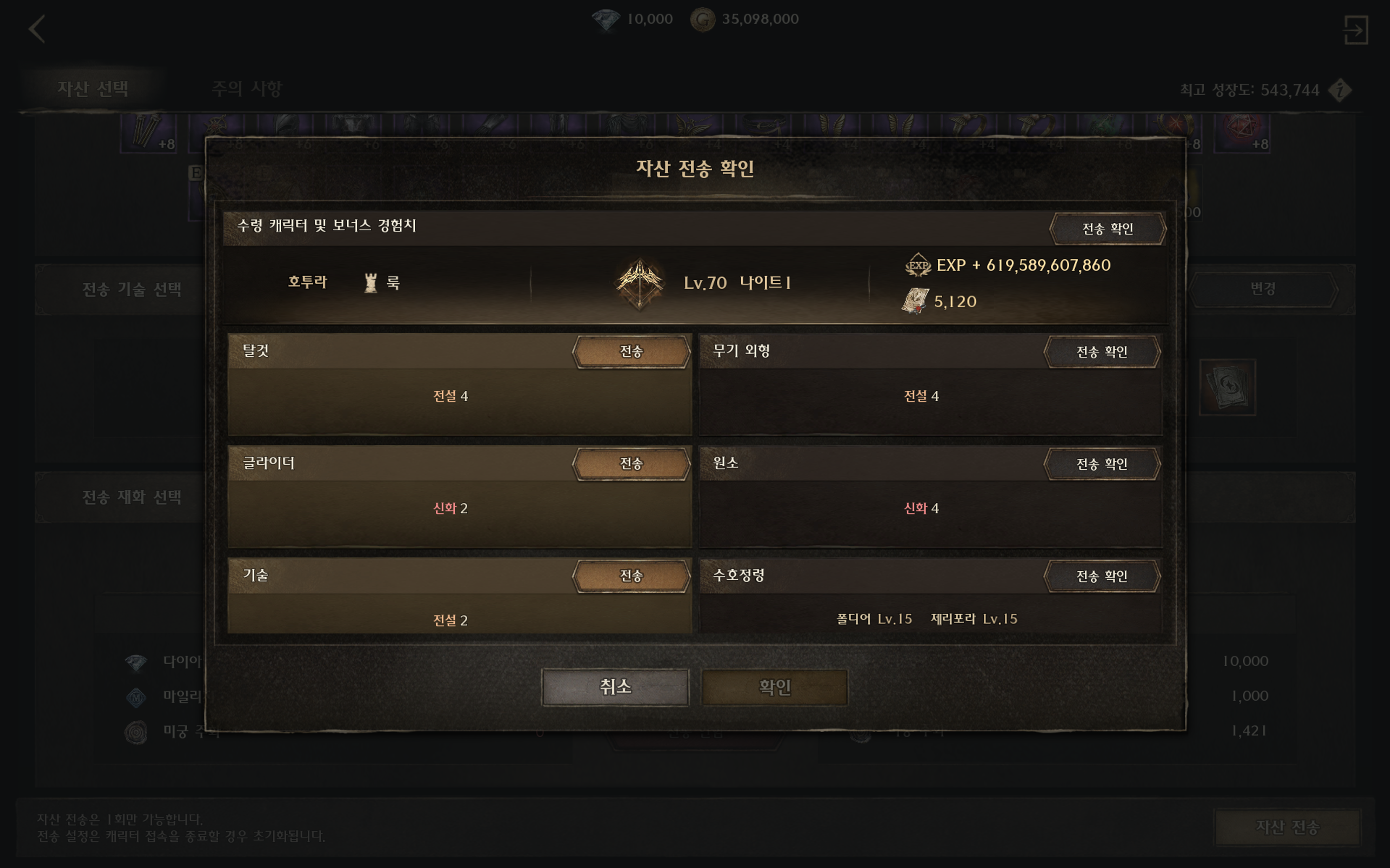 • 이전할 수 있는 자산의 종류 및 수량은 캐릭터의 성장도에 따라 달라집니다.