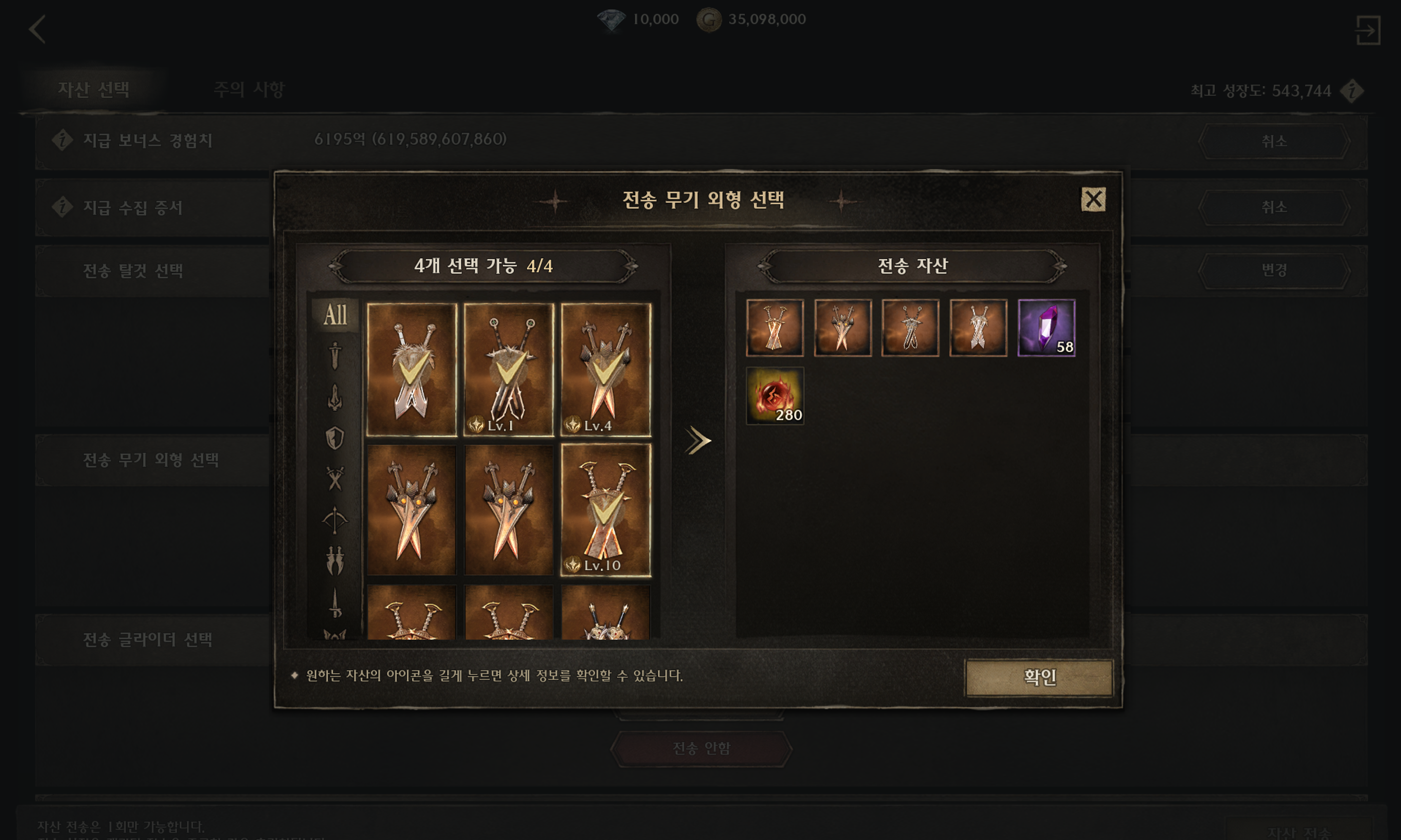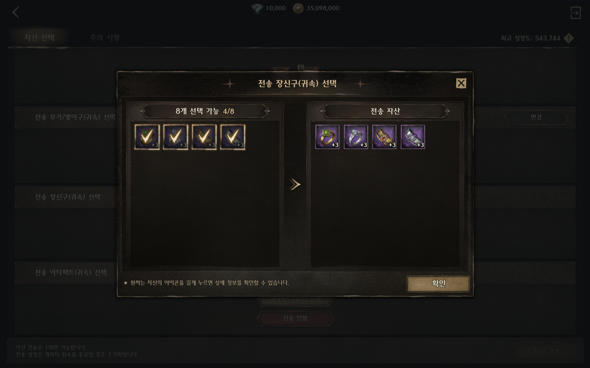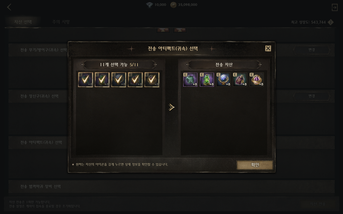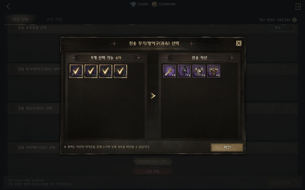 ⑥ 전송할 귀속 무기/방어구를 선택할 수 있습니다.