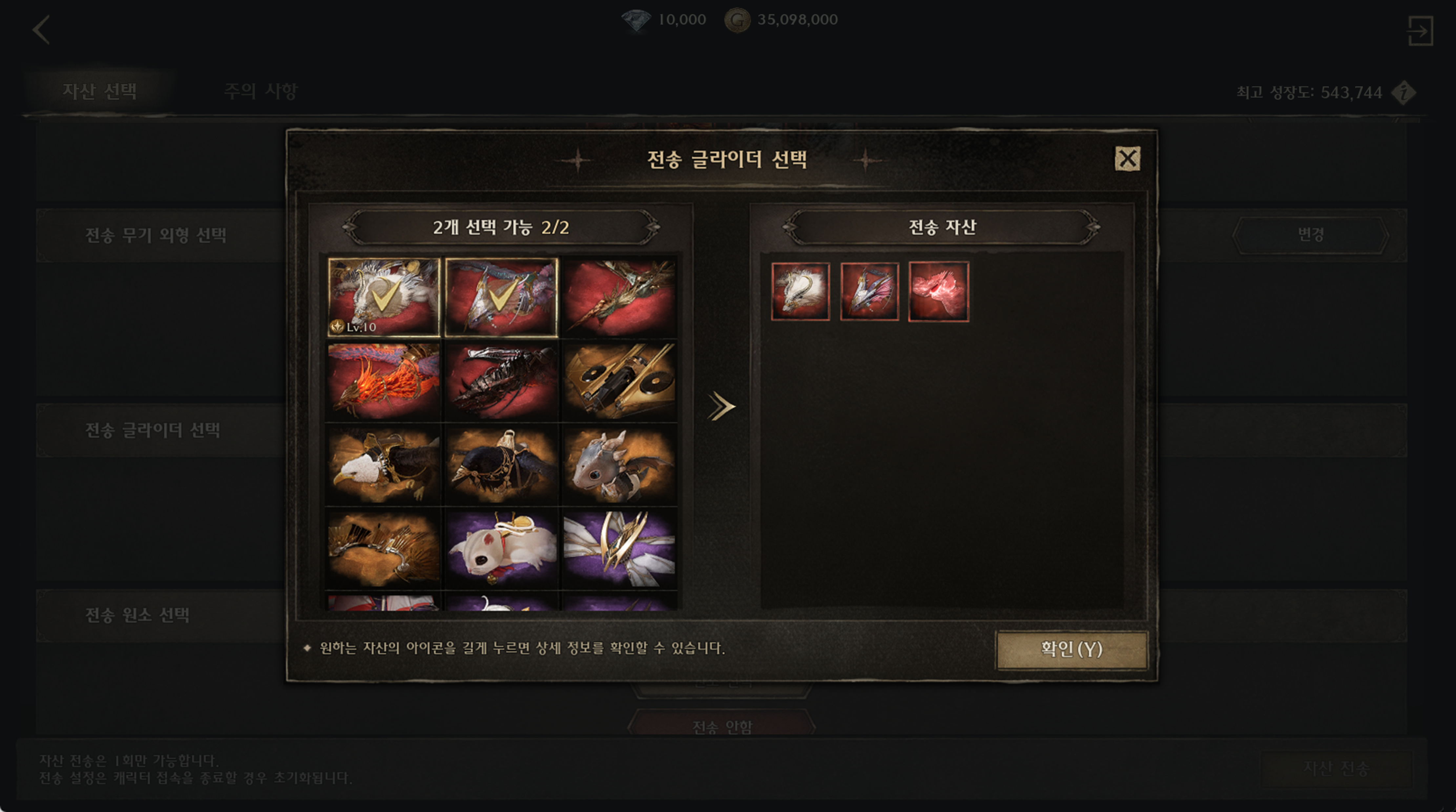 ◦ 자산 전송 품목은 '클래스 체인지' 콘텐츠와 같이 이전을 원하는 품목을 선택해 진행할 수 있습니다.