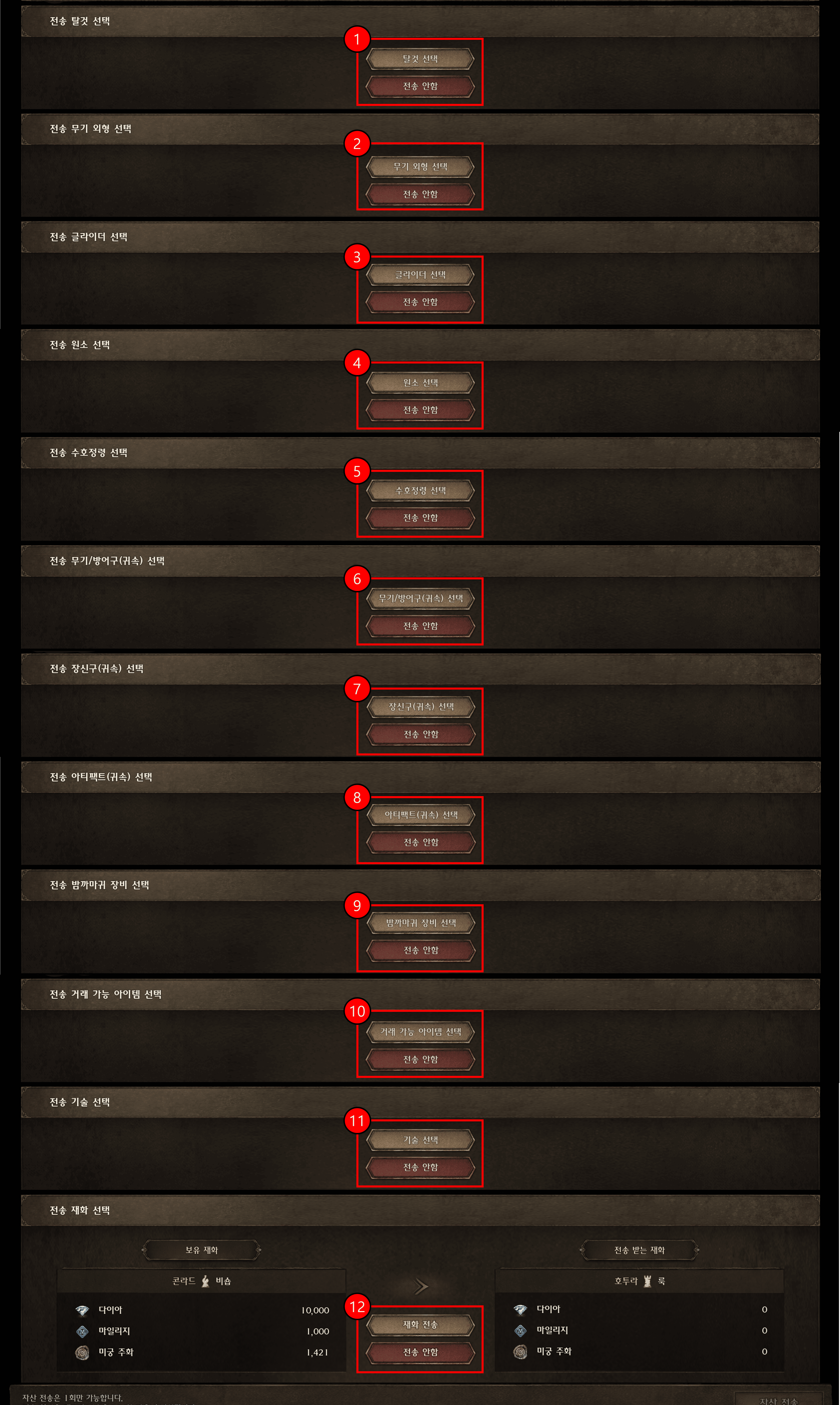 ⑩ 전송할 거래 가능 아이템을 선택할 수 있습니다.