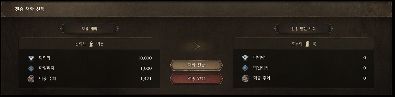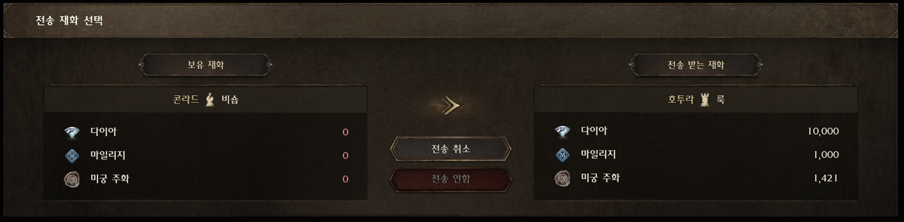 • 보유하고 있는 재화 중 다이아, 마일리지, 미궁 주화를 전송할 수 있습니다.