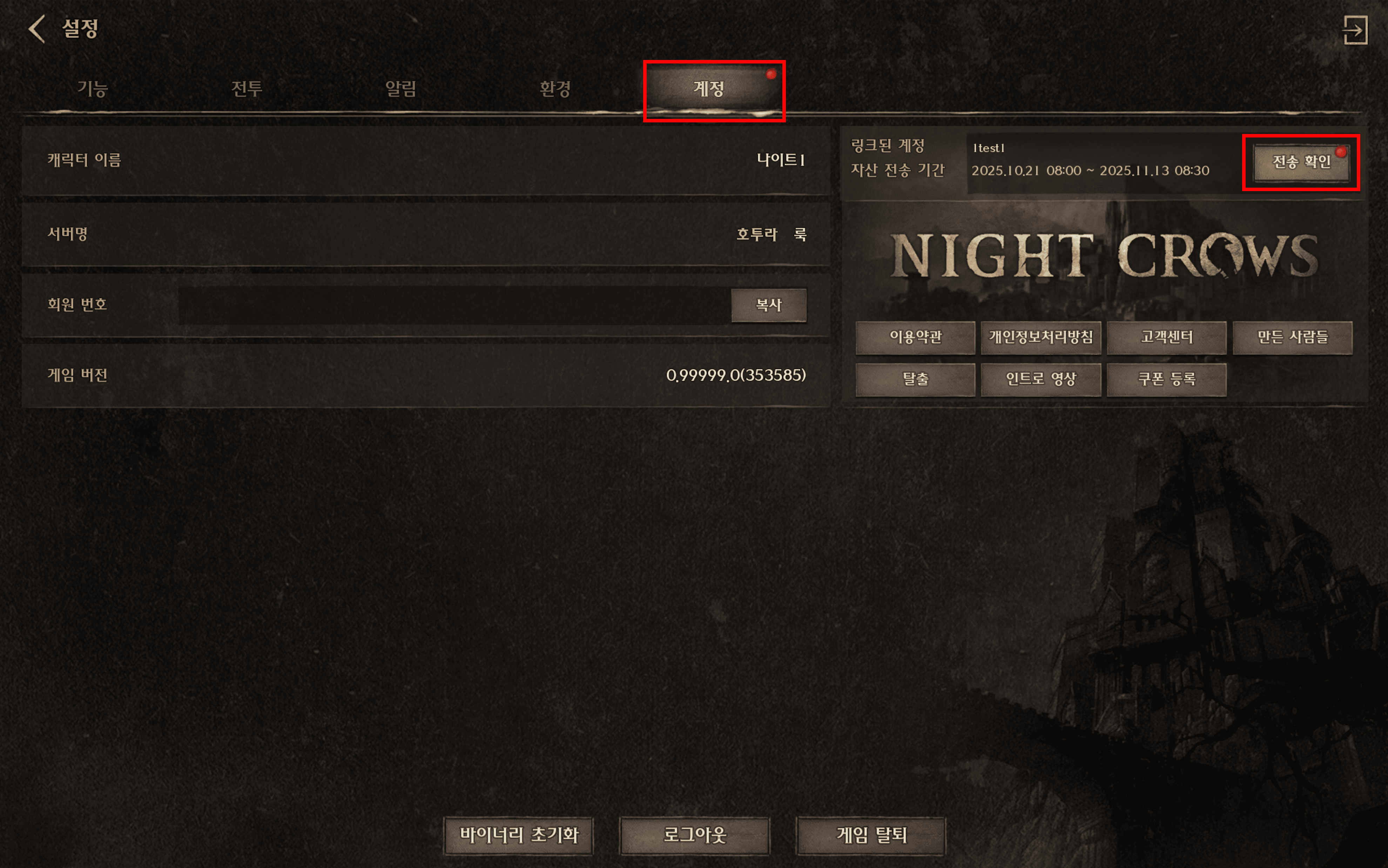 • 자산 수령 가능 기간 동안 [메뉴 > 설정 > 계정] 탭에서 [전송 확인] 버튼을 터치하여 전송되었던 자산을 언제든 확인 가능합니다.