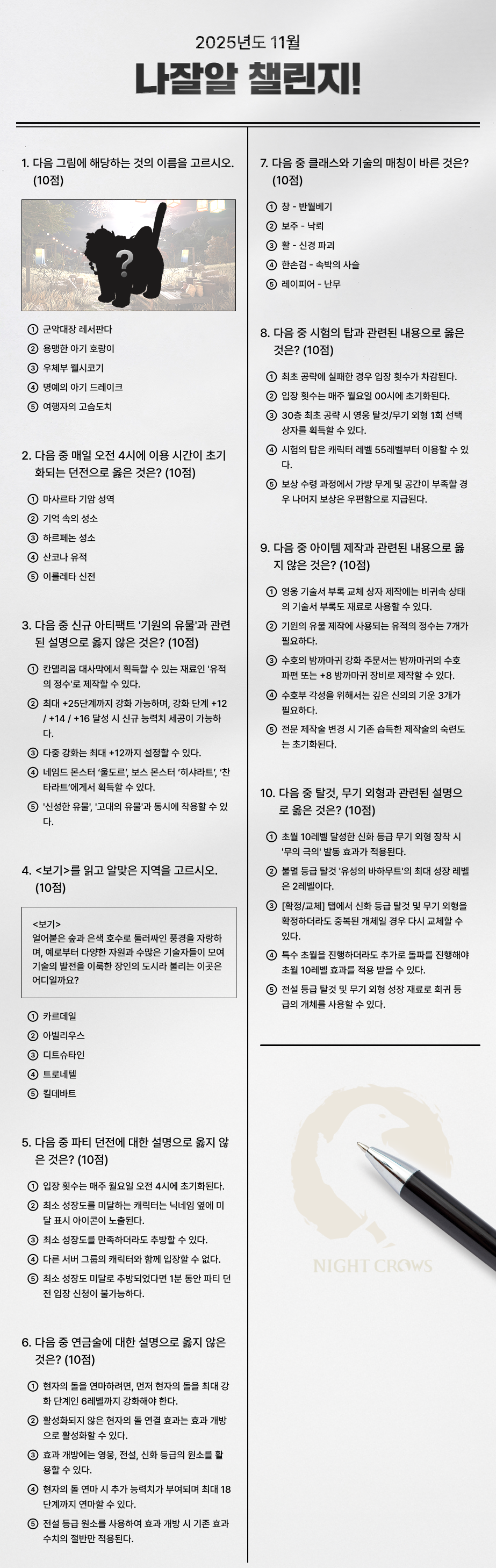 세계관부터 콘텐츠, TMI까지! 진정한 '나잘알'을 선별할 수 있는 나이트 크로우와 관련된 다양한 문제들이 단원님을 기다리고 있습니다.